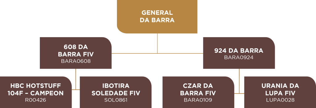 Um dos grandes diferenciais do General da Barra está em sua genealogia. Ele carrega uma ligação direta com a doadora Nuna, um dos nomes mais importantes da história do Senepol da Barra e da raça Senepol no Brasil.